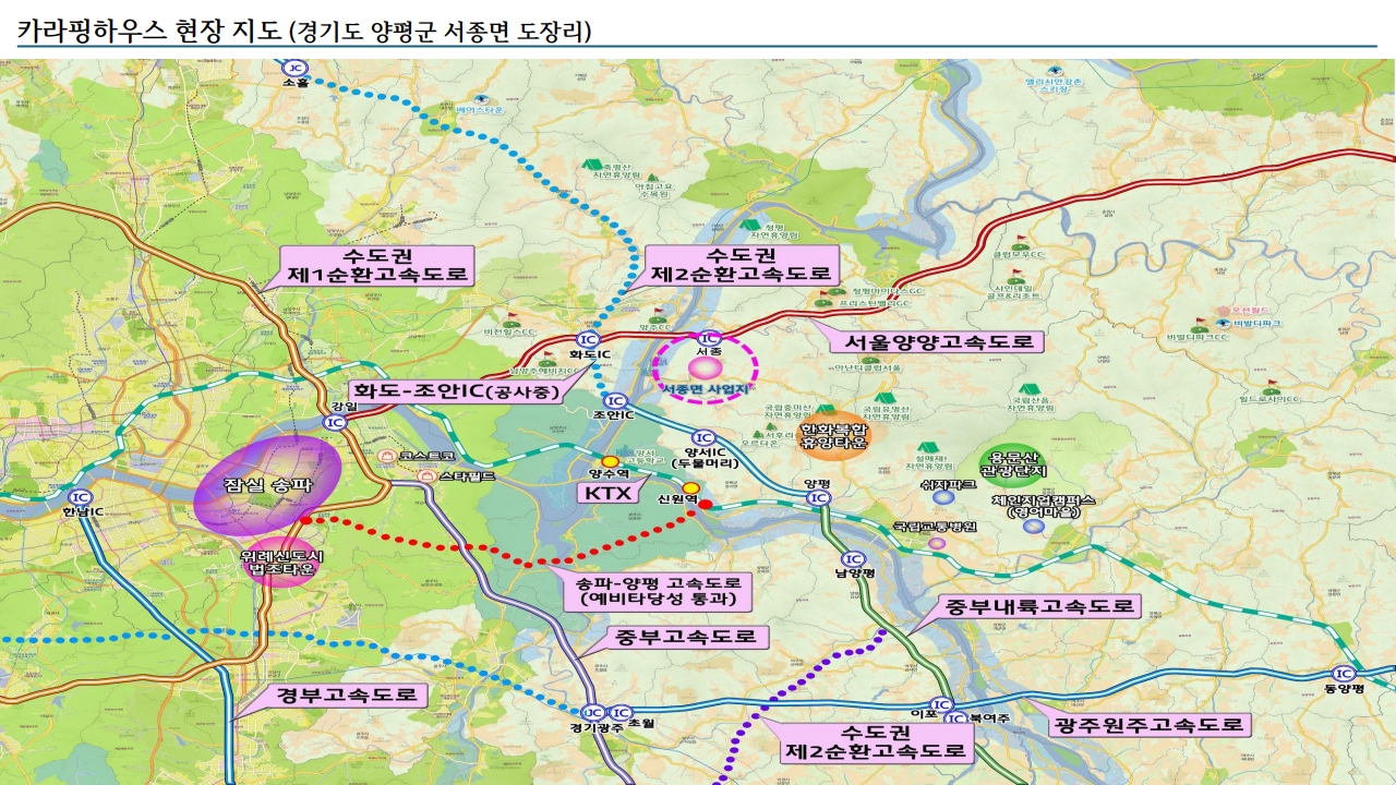 당 사업지는 경기도 양평군 서종면에 위치한 총 13,000평 규모의 복합 캠핑단지입니다. 약 85개 사이트로 일반적인 캠핑장 수준을 넘어 면적50~100평형 대지에 개별적으로 글램핑과 카라반, 썬룸이 설치되어 펜션 기능과 같이 사용할 수 있는 프라이빗한 고급형 캠핑장입니다 . 도심과 가까우면서도 자연속에서 사계절 내내 편안한 휴식공간으로 힐링할 수 있는 캠핑장입니다.