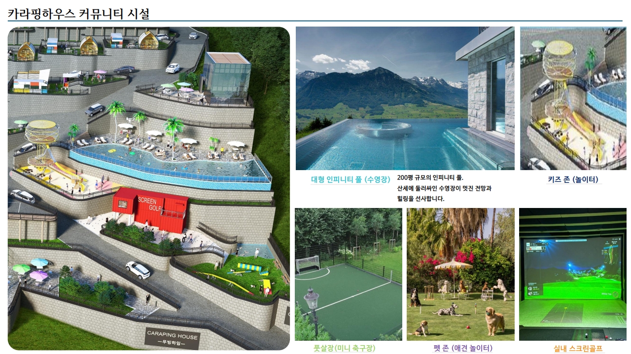 인피니티 풀(수영장), 실내 스크린 골프, 키즈 놀이터, 펫 존, 카페